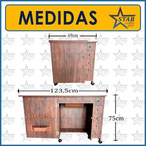 As medidas do gabinete são: largura de 45cm, altura de 76cm, comprimento fechado de 69cm e comprimento aberto de 123cm. A abertura da máquina possui as medidas de 42,5x18cm e a largura interna, espaço para as pernas, é de 49,5cm.