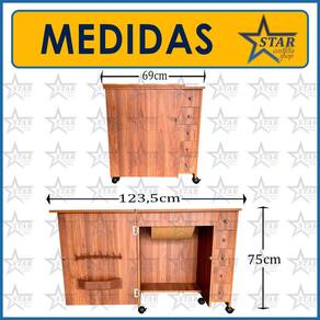 Fabricado em 100% MDF de 15mm de espessura, o mesmo material utilizado em móveis planejados de alto padrão, esse gabinete possui uma cor exatamente igual às fotos deste anúncio. Suas medidas são: largura de 45cm, altura de 76cm, comprimento fechado de 69cm e comprimento aberto de 123cm. A abertura da máquina possui as medidas de 42,5x18cm e a largura interna espaço para as pernas é de 49,5cm.