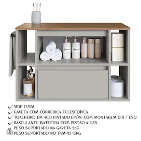 Gabinete para Banheiro, design funcional que alia praticidade e organização ao ambiente. Estrutura em MDP/MDF com acabamento em pintura UV texturizada. Conta com toalheiro lateral (em aço com pintura epóxi), gavetão com corrediças telescópicas, nichos decorativos funcionais e abertura tipo cava, além de porta basculante invertida com sistema de abertura por pistão a gás. Fixação por meio de parafusos. Este produto será entregue em 1 volume.