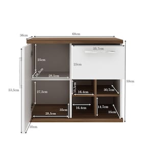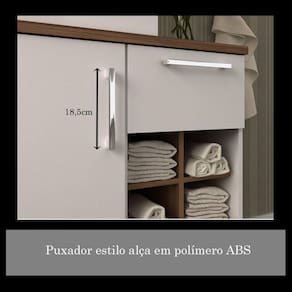 Gabinete 100% em MDF 15mm e 25mm, revestimento em BP, porta com prateleira interna e dobradiças metálicas. Gaveta com corrediças telescópicas que permitem a extração total da gaveta, puxadores em polímero ABS e Nichos externos para acomodação de objetos.