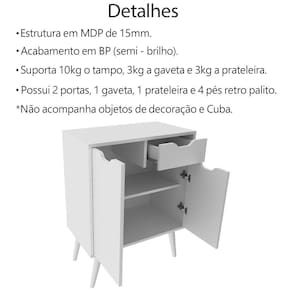 Gabinete Para Banheiro 2 Portas 1 Gaveta BN3637, ideal para inovar o seu banheiro com toque luxuoso e ao mesmo tempo refinado. Estrutura em MDP de 15mm, proporcionando maior durabilidade e resistência a peça, contando com acabamento revestido em BP (semi - brilho). Composto por 1 gaveta com corrediças metálicas, 2 portas com dobradiças metálicas, 1 prateleira com amplo espaço para armazenar diversos itens e 4 pés retro palito. Perfeito para deixar seu ambiente produtivo, proporcionando uma ambientação elegante e moderna. Este móvel chegará na sua casa separado em 1 volume.