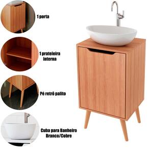 O Gabinete para Banheiro 45 cm com Cuba Redonda é ideal para quem busca um móvel compacto, estiloso e prático. Seu design retrô com pés palito traz um charme especial ao ambiente, tornando o banheiro mais acolhedor e elegante. Com linhas simples e acabamento sofisticado, ele se encaixa perfeitamente em lavabos e banheiros menores, otimizando o espaço sem abrir mão do visual.