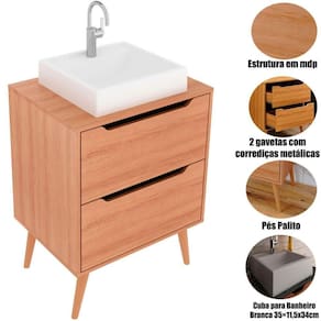 Características do Armário de Banheiro com Cuba: - Estrutura em mdp; - Acabamento em pintura UV; - 2 gavetas com corrediças metálicas; - Pés retrô palito; - Suporta 10 kg no tampo e 3 kg cada gaveta e cada prateleira; - Cuba em mármore sintético e acabamento em brilho polido; - Não acompanha torneira; - Não acompanha objetos de decoração;