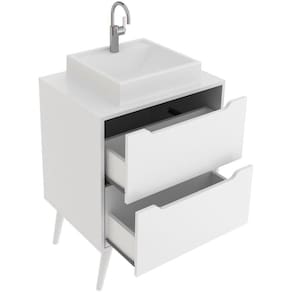 Características do Armário de Banheiro com Cuba: - Estrutura em mdp; - Acabamento em pintura UV; - 2 gavetas com corrediças metálicas; - Pés retrô palito; - Suporta 10 kg no tampo e 3 kg cada gaveta e cada prateleira; - Cuba em mármore sintético e acabamento em brilho polido; - Não acompanha torneira; - Não acompanha objetos de decoração;