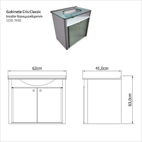 Gabinete em estrutura de alumínio em pintura eletrostática com vidros lapidados com película protetora, tampo com cuba moldada de incolor, frontão de acabamento no tampo, prateleira interna, gaveta interna, design exclusivo. Acabamento da Cuba: Alto Brilho Acabamento da Porta: Vidro Acabamento da Prateleira: BP Acompanha Cuba: Sim Acompanha Manual de Instalação: Sim Acompanha Parafusos Para Fixação Na Parede: Sim Acompanha Válvula: Sim Ambiente Principal: Banheiro codigo_ean: 7900288192066 Complexidade da Montagem: Baixa: pode ser montado por uma pessoa sozinha Comprimento da Prateleira: 56,2 cm Cor: Silver Cor do Produto: Silver Cor Interna: Branco Escala de Brilho: Semi-Brilho Escala de Brilho da Porta: Semi-Brilho Escala de Brilho da Prateleira: Fosco Espessura da Prateleira: 1,5 cm Formato da Cuba: Oval Furação para Cuba e Torneira: Sim Itens Inclusos: 1 Gabinete, Kit Ferragens e Manual de Montagem Linha ou Coleção: Classic Manual de Montagem e Instalação: https://product-hub-prd.madeiramadeira.com.br/197304158/documents/a3b9967a-835b-4b46-bf96-0723b1c2494c3005121582917502652192122.pdf Marca: Cris Metal Material da Cuba: Vidro Material da Porta: Vidro Material da Prateleira: MDF Material do Puxador da Porta: Alumínio Material do Tampo: Vidro Material Principal: Vidro Medida da Cuba (C x L x P): 40x28x9 Necessita Montagem: Sim Origem do Produto: Nacional Peso: 23,7 kg Peso Máximo por Prateleira: 7 kg Possui Espelhos: Não Possui Nichos: Não Possui Pés: Não Possui Portas: Sim Possui Prateleiras: Sim Possui Recorte No Tampo Para Cuba: Não Possui Recorte No Tampo Para Misturador: Não Possui Sifão: Não Possui Tampo: Sim Possui Tampo de Vidro: Sim Produto Montado: Sim Recomendações de Uso, Manutenção e Limpeza: Pano Úmido Resistente à Chuva: Não Sistema de Montagem: Bucha e Parafuso Suporta Até (kg): 30 kg Tamanho do Gabinete: Médio: de 60cm a 80cm de largura Tipo de Cuba: Embutir Tipo de Dobradiça/Corrediça da Porta: Metálica Tipo de Gabinete: Gabinete Suspenso Tipo de Móvel para Banheiro: Gabinete Tipo de Móvel para o Banheiro: Gabinete de Banheiro Tipo de Porta: Bater Tipo de Puxador da Porta: Externo Válvula indicada: Exclusiva