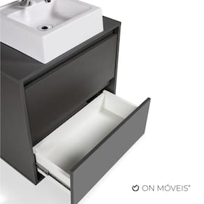 Sendo suas dimensões: 60cm de largura, 63cm de altura e 36cm de profundidade, o produto conta com uma porta basculante espaçosa, dobradiças com amortecimento e uma gaveta ampla com corrediças telescópicas para armazenar produtos de limpeza e higiene pessoal, mantendo-os sempre acessíveis.