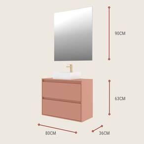 Sendo suas dimensões: 80cm de largura, 63cm de altura e 36cm de profundidade, o produto conta com uma porta basculante espaçosa, dobradiças com amortecimento e uma gaveta ampla com corrediças telescópicas para armazenar produtos de limpeza e higiene pessoal, mantendo-os sempre acessíveis.