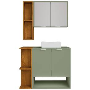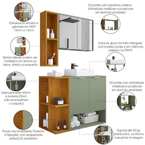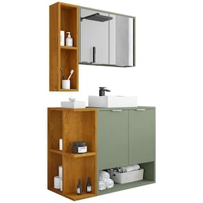 O gabinete suspenso conta com duas portas e um amplo espaço interno, enquanto a espelheira superior inclui portas com espelho e nichos laterais - perfeitos para organizar cosméticos e itens do dia a dia. Os nichos tanto do armário aéreo, quanto do gabinete são versáteis, podendo ser instalados tanto no lado direito quanto no esquerdo, adaptando-se ao seu espaço. Com linhas clean e acabamento luxuoso, esse kit para banheiro é a escolha ideal para quem busca praticidade sem abrir mão do estilo.