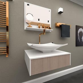 O Bancada Madri 50 Branco C/Cuba oferece um design moderno, com seus componentes fabricados em metal, tonalidade prateada. Este modelo é ideal para quem quer economizar sem deixar de adquirir artigos de luxo. É aplicável em banheiros e/ou lavabos, sua estética moderna e luxuosa oferece qualidade, resistência e praticidade. Produto: Conjunto Madri 50 Cômodo Indicado: Banheiros Local(is) Indicado(s): Banheiro/ Lavabos Marca: Gabinetto Linha: Luxo Produtos que compõem o Conjunto: 01 Bancada 01 Cuba Branca 01 Espelheira Borda Branca (COM ESPELHO) --------------------------------------------------------------------------------------------------------- MEDIDAS LAVABO/BANCADA: COMPRIMENTO: 50 CM ALTURA:15 CM PROFUNDIDADE: 44 CM --------------------------------------------------------------------------------------------------------- MEDIDA ESPELHEIRA: COMPRIMENTO: 50 CM ALTURA: 44 CM --------------------------------------------------------------------------------------------------------- PRATELEIRA: COMPRIMENTO: 45 CM PROFUNDIDADE: 9 CM CUBA: 41 X 35 CM --------------------------------------------------------------------------------------------------------- MATERIAL DO MÓVEL: MDF/ MDP --------------------------------------------------------------------------------------------------------- NÃO ACOMPANHA OS PARAFUSOS E BUCHAS, FICA A CRITÉRIO DO CLIENTE ADQUIRIR A MELHOR OPÇÃO PARA SUA PAREDE A BANCADA NÃO ABRE, NÃO É PORTA E NEM GAVETA, SE TRATA APENAS DE UM DETALHE NA BANCADA PORÉM TEMOS O MODELO MARANATA COM PORTA! --------------------------------------------------------------------------------------------------------- Instruções de Limpeza: Utilizar apenas pano umedecido com água e sabão neutro. ---------------------------------------------------------------------------------------------------------