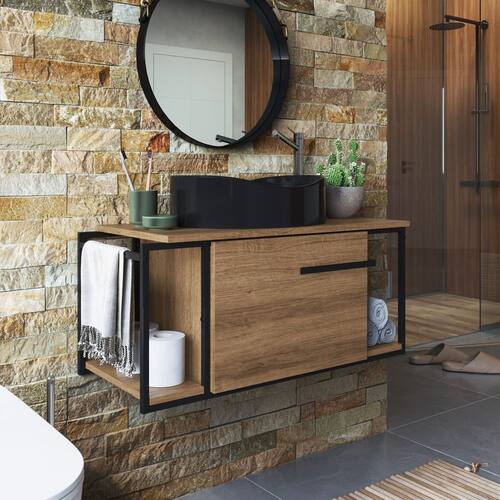 CARACTERÍSTICAS TÉCNICAS: - Estrutura metálica resistente; - Cor: Preto e Marrom; - Prateleiras e portas em MDP de 15mm; - Design industrial sofisticado; - Acompanha cuba Berlin preta; - Suporta até 15kg.