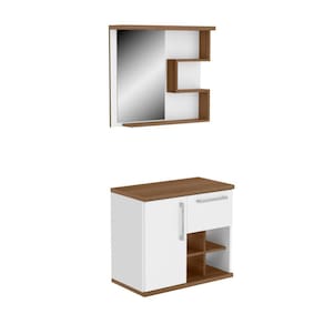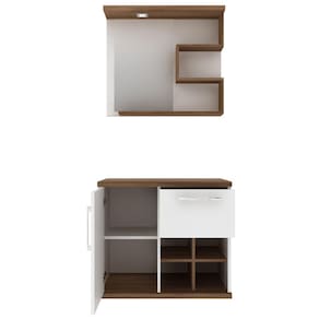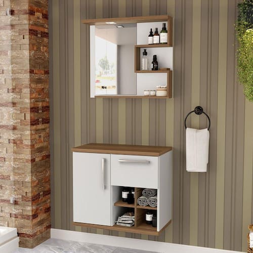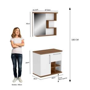 A linha Veneza destaca-se pelo design leve, sutil e delicado, garantindo mais leveza e únicoidade aos ambientes. Armário de 68cm comprimento x 16,2cm profundidade x 60cm altura com estrutura MDF 15mm e prancha em MDF 25mm com revestimento em material BP, proporcionando melhor resistência e durabilidade. Acompanha luminária LED 110/220 (bivolt). Sua instalação é muito simples, pois, já possuí furações e acompanha chapinhas de fixação. Gabinete de 68cm x comprimento 36 x profundidade x 58cm de altura 100% MDF 15mm com tampo e base em MDF 25mm, sendo revestido em material BP, proporcionando melhor resistência e durabilidade. Porta com prateleira interna e dobradiças metálicas. Gaveta com corrediças telescópicas que permitem a extração total da gaveta, puxadores em polímero ABS. Acabamento da Gaveta: BP Acabamento da Porta: BP Acabamento da Prateleira: BP Acompanha Cuba: Não Acompanha Lâmpada: 01 Acompanha Tampo: Não Ambiente Principal: Banheiro Complexidade da Montagem: Média: pode ser montado por mais de uma pessoa e/ou necessite de maior conhecimento para montagem Cor: Branco/Nogal Cor do Produto: Branco/Nogal Cor Interna: Branco Escala de Brilho: Fosco Escala de Brilho da Gaveta: Fosco Escala de Brilho da Porta: Fosco Escala de Brilho da Prateleira: Fosco Espessura do Espelho: 3 Formato do Espelho: Quadrado Furação para Cuba e Torneira: Não Gaveta com Chave: Não Itens Inclusos: 1 Balcão, 1 Espelheira, Kit Ferragens e Manual de Montagem Linha ou Coleção: Veneza Manual de Montagem e Instalação: https://cdn2.madeiramadeira.com.br/atributo/moveis-bosi/1172846-veneza-nogal-armario-imprimir-1-pag-por-folha-frente-e-verso.pdf Material da Gaveta: MDF Material da Porta: MDF Material da Prateleira: MDF Material do Puxador da Gaveta: ABS Material do Puxador da Porta: ABS Material Principal: MDF Medida da Espelheira (A x L x P): 60x67,9x16,1cm Medida do Gabinete (A x L x P): 59x68x36cm Necessita Montagem: Sim Origem do Produto: Nacional Peso: 35.44 Peso Máximo por Gaveta: 5 Peso Máximo por Prateleira: 5 Possui Espelheira: Sim Possui Gabinete: Sim Possui Gavetas: 01 Possui iluminação: Sim Possui Pés: Não Possui Portas: 01 Possui Rodízio: Não Recomendações de Uso, Manutenção e Limpeza: Utilizar flanela ou pano macio seco, não utilizar produtos abrasivos, desengordurantes, álcool ou solvente. Não expor o produto diretamente à luz solar e à umidade. Sistema de Montagem: Parafuso, bucha, minifix Suporta Até (kg): 10 Tamanho do Espelho (A x L): 55x35cm Tipo de Corrediça da Gaveta: Metálica Telescópica Tipo de Dobradiça/Corrediça da Porta: Metálica Tipo de Gabinete: Gabinete Suspenso Tipo de Porta: Bater Tipo de Puxador da Gaveta: Externo Tipo de Puxador da Porta: Externo