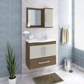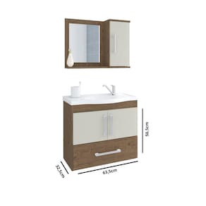 O Gabinete Para Banheiro Com Lavatório E Espelho Atenas Amendoa E Off White MGM Móveis 65cm combina estilo e funcionalidade para o seu banheiro. Suspenso, possui duas portas, uma gaveta com corrediça telescópica e puxadores em ABS. A espelheira tem uma porta e duas prateleiras, enquanto a estrutura 100% MDF oferece resistência, complementada pelo lavatório de mármore sintético. Aproveite essa solução prática e durável para organizar seu ambiente. Confira na ABC da Construção e conheça o Gabinete Para Banheiro Com Lavatório E Espelho Atenas Amendoa E Off White MGM Móveis 65cm, o armário/gabinete para banheiro ideal para sua casa!