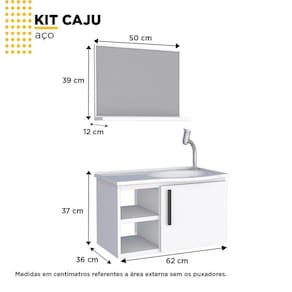 O kit em aço para banheiro Caju, da Cozimax, é uma excelente opção para deixar seu banheiro cheio de estilo. Fabricado em aço eletrogalvanizado com garantia de 5 anos, é protegido por pintura em pó eletrostática, possui espelheira com prateleira, lavatório em mármore sintético com linhas curvas, nichos para guardar os produtos de higiene e limpeza, porta com puxador em ABS. Acabamento da Porta: Pintura Acompanha Cuba: Não Acompanha Tampo: Sim Ambiente Principal: Banheiro Cor: Branco Cor do Produto: Branco Escala de Brilho: Brilhante Escala de Brilho da Porta: Brilhante Espessura do Espelho: 2 Formato do Espelho: Retangular Furação para Cuba e Torneira: Sim Itens Inclusos: 1 Gabinete com Lavatório, 1 Espelheira, Kit Ferragens e Manual de Instalação Linha ou Coleção: Caju Manual de Montagem e Instalação: https://cdn2.madeiramadeira.com.br/atributo/cozimax/1396248-1243-touc-caju.pdf Material da Porta: Aço Material do Tampo: Mármore Sintético Material Principal: Aço Medida do Gabinete (A x L x P): 37x62x36 Necessita Montagem: Não Origem do Produto: Nacional Peso: 10 Possui Espelheira: Não Possui Gabinete: Sim Possui Gavetas: Não Possui iluminação: Não Possui Pés: Suspenso Possui Portas: 01 Possui Rodízio: Não Recomendações de Uso, Manutenção e Limpeza: Pano Umedecido Tamanho do Espelho (A x L): 39x50 Tipo de Dobradiça/Corrediça da Porta: Metálica Tipo de Gabinete: Gabinete Suspenso Tipo de Porta: Bater Tipo de Puxador da Porta: Externo Ean: 7909903352090