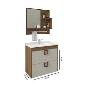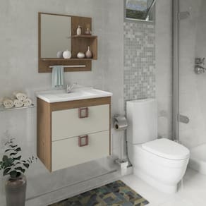 O Gabinete Para Banheiro Com Lavatório E Espelho Lírio Amendoa E Off White MGM Móveis 59cm oferece praticidade e sofisticação ao banheiro. Com porta basculante de abertura a pistão à gás e gaveta com corrediça telescópica, ele garante funcionalidade e fácil acesso. A espelheira possui duas prateleiras e toalheiro em alumínio, complementando o design moderno. Estrutura em MDF e lavatório de mármore sintético asseguram durabilidade. Confira na ABC da Construção e conheça o Gabinete Para Banheiro Com Lavatório E Espelho Lírio Amendoa E Off White MGM Móveis 59cm, o armário/gabinete para banheiro ideal para sua casa!