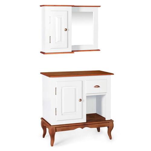 O Gabinete de Banheiro 80cm é a solução completa para seus desafios de armazenamento. Com uma portas, prateleira e nicho, ele oferece espaço amplo para guardar seus itens essenciais, mantendo tudo no lugar certo. Com o aéreo com espelho sua imagem é refletida com clareza, enquanto a sua porta garante um espaço especialmente para organizar seus itens pessoais. Produzidos em Madeira Maciça para tons amadeirado em verniz e MDF nos tons coloridos com acabamento laca, esse gabinete é sinônimo de qualidade e durabilidade. Além disso, possuí pés no estilo Luis XV, dando um toque clássico ao móvel.