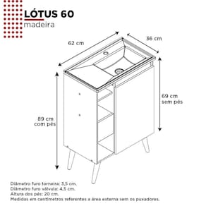 O toucador em madeira para banheiro Lótus 60, da Cozimax, é a melhor opção para quem busca um produto com estilo e qualidade. Fabricado com chapas de madeira MDP, protegido por uma superfície melamínica, possui lavatório em mármore sintético, porta com espaço interno para guardar os produtos de higiene, gaveta com corrediças telescópicas, três nichos, pés em madeira. Acabamento da Gaveta: Pintura Acabamento da Porta: Pintura Acabamento dos Pés: Verniz Acompanha Cuba: Não Acompanha Parafusos Para Fixação Na Parede: Não Altura dos Pés: 20 Ambiente Principal: Banheiro Cor: Jequitibá/Verde Cor do Produto: Jequitibá/Verde Escala de Brilho: Fosco Escala de Brilho da Gaveta: Fosco Escala de Brilho da Porta: Fosco Gaveta com Chave: Não Itens Inclusos: 1 Gabinete, Kit Ferragens e Manual de Instação Linha ou Coleção: Lótus 60 Manual de Montagem e Instalação: https://cdn2.madeiramadeira.com.br/atributo/cozimax/1395055-1345-toucador-lotus-com-pes-60-exp.pdf Material da Gaveta: MDP Material da Porta: MDP Material dos Pés: Madeira Maciça Material Principal: MDP Medida do Recorte Para Misturador: 2,5cm Necessita Montagem: Não Origem do Produto: Nacional Peso: 20 Peso Máximo por Gaveta: 5 Possui Nichos: 03 Possui Pés: 04 Possui Portas: 01 Possui Prateleiras: Não Possui Recorte No Tampo Para Cuba: Não Possui Recorte No Tampo Para Misturador: Sim Possui Rodízio: Não Possui Sifão: Não Possui Tampo: Não Recomendações de Uso, Manutenção e Limpeza: Pano Umedecido Sapatas Niveladoras: Não Suporta Até (kg): 15 Suporte para Toalheiro: Não Tamanho Indicado Para Cuba: Incluso lavatório Tipo de Corrediça da Gaveta: Metálica Telescópica Tipo de Dobradiça/Corrediça da Porta: Metálica Tipo de Gabinete: Gabinete de Chão Tipo de Madeira Maciça dos Pés: Pinus Tipo de Móvel para o Banheiro: Gabinete de Banheiro Tipo de Porta: Bater Tipo de Puxador da Gaveta: Embutido Tipo de Puxador da Porta: Embutido