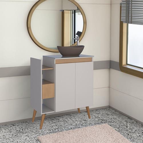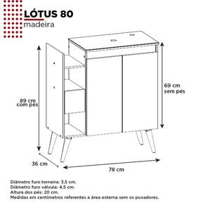 O toucador em madeira para banheiro Lótus 80, da Cozimax, é a melhor opção para quem busca um produto com estilo e qualidade. Fabricado com chapas de madeira MDP, protegido por uma superfície melamínica, possui tampo de vidro temperado, duas portas com espaço interno para guardar os produtos de higiene, gaveta com corrediças telescópicas, dois nichos, pés em madeira. Acabamento da Gaveta: Pintura Acabamento da Porta: Pintura Acompanha Cuba: Não Acompanha Parafusos Para Fixação Na Parede: Não Altura dos Pés: 20 cm Ambiente Principal: Banheiro Complexidade da Montagem: Baixa: pode ser montado por uma pessoa sozinha Cor: Jequitibá/Nude Cor do Produto: Jequitibá/Nude Escala de Brilho: Fosco Escala de Brilho da Porta: Fosco Gaveta com Chave: Não Itens Inclusos: 1 Gabinete, kit ferragens e manual de montagem Linha ou Coleção: Lótus 80 Manual de Montagem e Instalação: https://cdn2.madeiramadeira.com.br/atributo/cozimax/1394989-1367-manual-toucador-lotus-80-com-pes-exp.pdf Material da Gaveta: MDP Material da Porta: MDP Material do Tampo: MDF Material dos Pés: Madeira Maciça Material Principal: MDP Medida do Recorte Para Misturador: 2,5cm Necessita Montagem: Sim Origem do Produto: Nacional Peso: 23 kg Peso Máximo por Gaveta: 5 kg Possui Nichos: 02 Possui Pés: 04 Possui Portas: 02 Possui Prateleiras: Não Possui Recorte No Tampo Para Cuba: Não Possui Recorte No Tampo Para Misturador: Sim Possui Rodízio: Não Possui Sifão: Não Possui Tampo: Sim Recomendações de Uso, Manutenção e Limpeza: Pano Umedecido Sapatas Niveladoras: Não Sistema de Montagem: Parafusos Suporta Até (kg): 15 kg Tamanho Indicado Para Cuba: 30cmx30cm Tipo de Corrediça da Gaveta: Metálica Telescópica Tipo de Dobradiça/Corrediça da Porta: Metálica Tipo de Gabinete: Gabinete de Chão Tipo de Madeira Maciça dos Pés: Pinus Tipo de Móvel para o Banheiro: Gabinete de Banheiro Tipo de Porta: Bater Tipo de Puxador da Gaveta: Embutido Tipo de Puxador da Porta: Embutido
