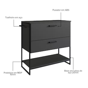 Com robusta estrutura em metal, oferece máxima organização com porta, gaveta, prateleira e um prático toalheiro lateral.