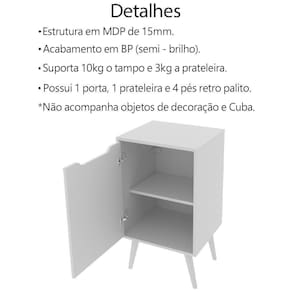 Gabinete Para Banheiro Pes Palito 1 Porta BN3641, ideal para inovar o seu banheiro com toque luxuoso e ao mesmo tempo refinado. Estrutura em MDP de 15mm, proporcionando maior durabilidade e resistência a peça, contando com acabamento revestido em BP (semi - brilho). Composto por 1 porta com dobradiças metálicas, 1 prateleira com amplo espaço para armazenar diversos itens e 4 pés retro palito. Suportando 10kg o tampo e 3kg a prateleira. Perfeito para deixar seu ambiente produtivo, proporcionando uma ambientação elegante e moderna. Este móvel chegará na sua casa separado em 1 volume.