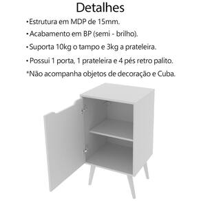 Gabinete Para Banheiro Pes Palito 1 Porta BN3641, ideal para inovar o seu banheiro com toque luxuoso e ao mesmo tempo refinado. Estrutura em MDP de 15mm, proporcionando maior durabilidade e resistência a peça, contando com acabamento revestido em BP (semi - brilho). Composto por 1 porta com dobradiças metálicas, 1 prateleira com amplo espaço para armazenar diversos itens e 4 pés retro palito. Suportando 10kg o tampo e 3kg a prateleira. Perfeito para deixar seu ambiente produtivo, proporcionando uma ambientação elegante e moderna. Este móvel chegará na sua casa separado em 1 volume.