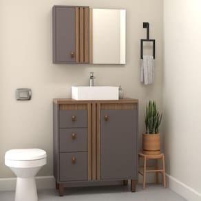 Prático e funcional Conta com uma porta e três gavetas com corrediças telescópicas, que garantem fechamento suave e espaço interno eficiente para organização de itens de higiene.