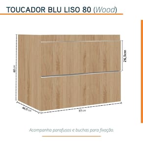 Produto fabricado em MDP PF (15mm). Puxadores de alumínio anodizado; caixaria estruturada com cantoneiras metálicas; gavetas com corrediças telescópicas proporcionando abertura total das mesmas; gaveta com divisores e higiênico organizador dental (removível e lavável); e gaveta interna com manta anti-derrapante, protegendo o fundo da mesma. Acompanha parafusos buchas para fixação na parede. Possui manual de instalação. Ideal para compor com o Lavatório 80 da Marca BLU LAVATÓRIOS (vide site do Madeira Madeira). Produto sai montado de fábrica, devidamente regulado, bastando apenas fixá-lo na parede. Garantia de 12 meses para defeito de fabricação. Acabamento da Gaveta: BP Acompanha Cuba: Não Acompanha Manual de Instalação: Sim Acompanha Parafusos Para Fixação Na Parede: Sim Ambiente Principal: Banheiro codigo_ean: 7909903692554 Cor: Wood Cor do Produto: Wood Cor Interna: Wood Escala de Brilho: Acetinado Escala de Brilho da Gaveta: Semi-Fosco Furação para Cuba e Torneira: Não Gaveta com Chave: Não Informações Complementares: Produto sai montado de fábrica, devidamente regulado, bastando apenas fixá-lo na parede. Acompanha buchas de nylon + parafusos para fixação na parede. Itens Inclusos: 01 Gabinete Suspenso 80cm Linha ou Coleção: Coleção Ripy Manual de Montagem e Instalação: https://product-hub-prd.madeiramadeira.com.br/906048/documents/6ed31267-6829-49bb-bdb9-42d97c69a974193215634861715172284998.pdf Material da Gaveta: MDF/MDP Material do Puxador da Gaveta: Alumínio Material Principal: MDF/MDP Necessita Montagem: Não Origem do Produto: Nacional Peso: 27 kg Peso Máximo por Gaveta: 5 kg Possui Nichos: Não Possui Pés: Suspenso Possui Portas: Não Possui Prateleiras: Não Possui Recorte No Tampo Para Cuba: Não Possui Recorte No Tampo Para Misturador: Não Possui Sifão: Não Possui Tampo: Não Produto Montado: Sim Quantidade de Gavetas: 02 Recomendações de Uso, Manutenção e Limpeza: Nunca utilizar produtos químicos. Use somente flanela levemente umedecida em água e em seguida uma outra seca e macia. Caso ocorra vazamento ou acúmulo de água no produto, enxugar imediatamente. Resistente à Chuva: Não Sapatas Niveladoras: Não Suporta Até (kg): 10 kg Suporte para Toalheiro: Não Tamanho Indicado Para Cuba: 80 Tipo de Corrediça da Gaveta: Metálica Telescópica Tipo de Móvel para o Banheiro: Gabinete de Banheiro Tipo de Puxador da Gaveta: Externo Tipo do produto: Gabinete