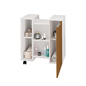 Conta com 1 porta com dobradiças metálicas, 6 nichos internos para melhor organização e 4 rodízios, que facilitam a locomoção sempre que necessário. Produzido em MDP de 12 mm, possui acabamento em verniz poliéster brilhante com secagem UV, impressão a laser e bordas protegidas com fita decorativa aplicada por sistema hot melting.
