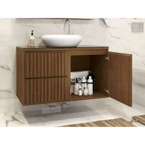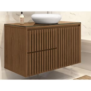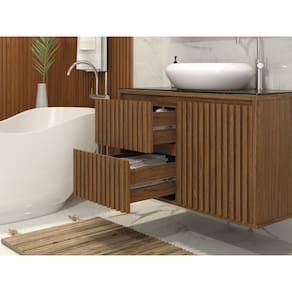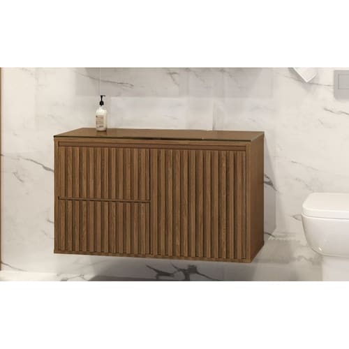 O gabinete possui tampo de vidro de 8mm de espessura que da beleza e maior resistência ao seu produto, puxadores em cava 45º, dando estilo e leveza ao ambiente, gavetas com corrediças telescópicas e sistema Slow de fechamento suave, também possui divisórias internas que facilitam a organização de seu banheiro