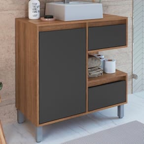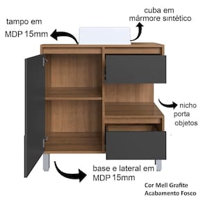 Características adicionais: acompanha 1 cuba em mármore sintético, 1 porta, 2 gavetas, 1 nicho externo, dobradiças e corrediças metálicas, pés em ABS reguláveis