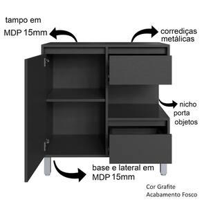 Características adicionais: Balcão com 1 porta e 2 gavetas; armário espelheira com 1 portas com espelho e prateleiras externas, dobradiças e corrediças metálicas, pés em ABS reguláveis.