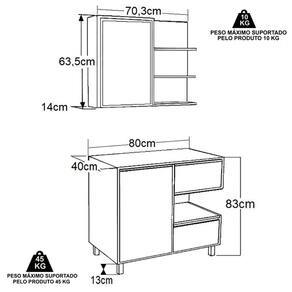 Características adicionais: Balcão com 1 porta e 2 gavetas; armário espelheira com 1 portas com espelho e prateleiras externas, dobradiças e corrediças metálicas, pés em ABS reguláveis.