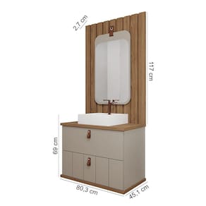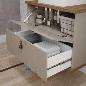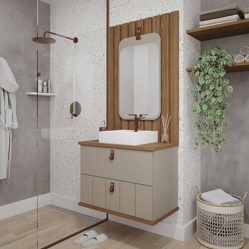 Características: Estrutura em MDF Acabamento em Pintura UV Puxadores e alça em couro 01 Porta com pistão à gás e dobradiças metálicas 01 Gaveta com corrediças telescópicas Acompanha cuba em mármore sintético Acompanha espelho Acompanha painel ripado