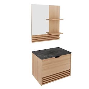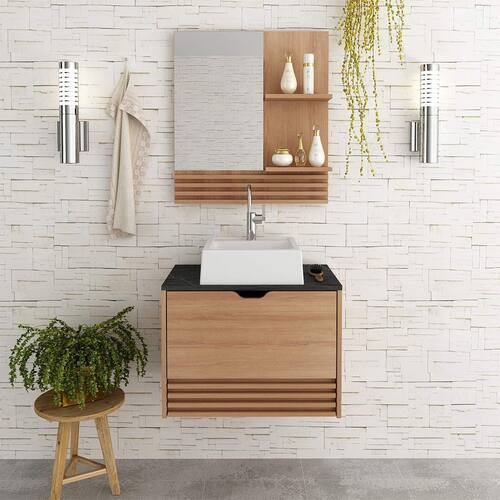 CARACTERÍSTICAS TÉCNICAS: - Produzida em MDP de 15 mm - Acabamento UV na cor Amêndoa e Mármore Lunar - Acompanha Espelho - Porta Basculante com Articulador e Dobradiças Metálicas - Gaveta com Corrediças Metálicas - Puxador tipo Cava - Balcão Suspenso *Cuba NÃO incluso, apenas demonstrativo *Kit Composto por Gabinete Suspenso (3613) e Espelheira (3614)