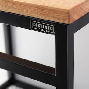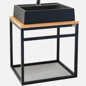 A superfície de madeira em eucalipto com acabamento em verniz incolor adiciona calor e beleza natural ao design industrial, criando um contraste visualmente impressionante. A prateleira em tela expandida não só contribui para o visual industrial, mas também oferece espaço adicional para armazenamento e exibição.