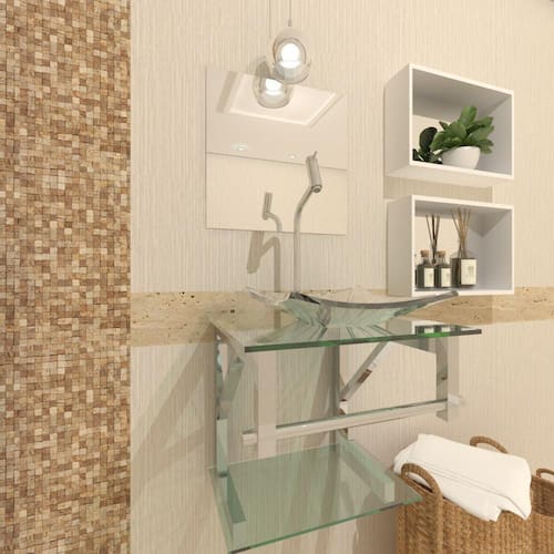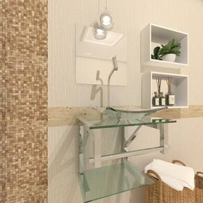Itens inclusos: - bancada de vidro com furo para torneira 3,5cm diâmetro e válvula click 4,5cm diâmetro ; - cuba de vidro; - espelheira espelho ; - estrutura e porta toalha de inox; - kit parafusos completo para instalação; - prateleira de vidro da bancada; - torneira de metal cromada - válvula click.