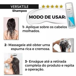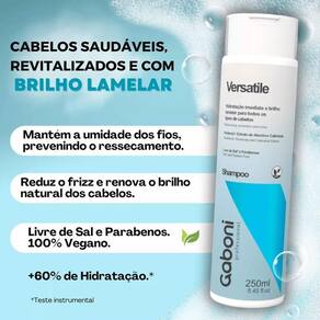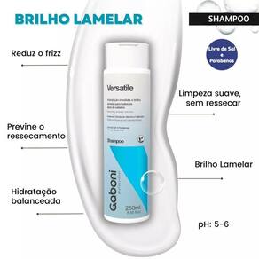 Gaboni versatile shampoo 250ml Shampoo hidratação imediata e brilho lamelar Contém: pantenol / extratos de hortelã, alecrim, hamamélis, calêndula, camomila e malva / óleo de babaçu / de murumuru / proteína do trigo. Rendimento aproximado: 15 aplicações Ph: 5,0 a 6,0 Cabelos saudáveis, revitalizados e cheios de vida. Limpa suavemente os fios, promovendo maciez e hidratação. Com ativos de alta performance, para uso diário, garante brilho e uma agradável sensação de limpeza duradora. Sua fórmula emoliente e tonificante, mantém a umidade natural dos fios sem provocar oleosidade, hidratando, condicionando e renovando o brilho natural dos cabelos. Modo de usar: aplique sobre os cabelos molhados e massageie até obter uma espuma rica e cremosa. Enxágue até a retirada completa do produto e repita a operação. Livre de sal cloreto de sódio e parabenos. Benefícios: 1. Limpeza suave: por ser formulado como um uso diário, este shampoo proporciona uma limpeza eficaz, mas suave, removendo impurezas e excesso de oleosidade sem agredir os fios. 2. Brilho 3d: agentes que promovem o brilho ajudam a refletir a luz sobre o cabelo, proporcionando um aspecto saudável e luminoso. 3. Hidratação balanceada: ajudam a manter a umidade dos fios, prevenindo o ressecamento. 4. Versatilidade: ideal para diferentes tipos de cabelo, este shampoo pode ser utilizado tanto em fios lisos quanto cacheados, atendendo a diversas necessidades capilares. 5. Facilidade de uso: por ser um produto de uso diário, ele se adapta facilmente à rotina de cuidados com os cabelos, tornando o processo de lavagem mais prático e eficiente. 6. Melhoria na maleabilidade: o uso regular de um shampoo que proporciona brilho ajuda na maciez do cabelo, facilitando o desembaraço e melhorando a maleabilidade dos fios. 7. Aparência saudável: com o uso contínuo, pode contribuir para a saúde geral do cabelo, reduzindo o frizz e aumentando o volume de forma controlada. uso diário; limpeza suave, sem agredir os fios; mantém a umidade dos fios, prevenindo o ressecamento; facilita o desembaraço e melhora a maleabilidade dos fios; reduz o frizz e renova o brilho natural dos cabelos; proporciona um aspecto saudável e luminoso.