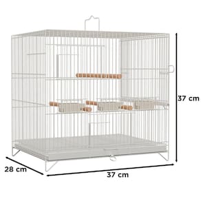 Comprimento: 37 cm Altura: 37 cm Largura: 28 cm Espaçamento entre malhas: 10 mm Pintura em tinta epóxi branca 2 Portas de mola Fundo aramado removível Fundo de chapa removível Pássaro indicado: Coleiro e Curió Passador lateral na direita Alça para transporte 3 Comedouros Marca: Não Informado