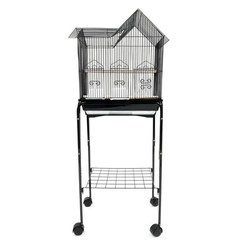 Gaiola para pássaros no topo de uma vila pequena com espaçamento de barra de 3/8" em preto. Ele vem com porta elevatória, 2 portas de alimentação, 2 xícaras e 2 poleiros, caixa de metal removível e bandeja plástica inferior deslizante. A dimensão da gaiola é 16L"x12D"x20H”. Com suporte de 18 x 18,