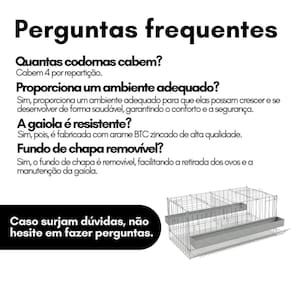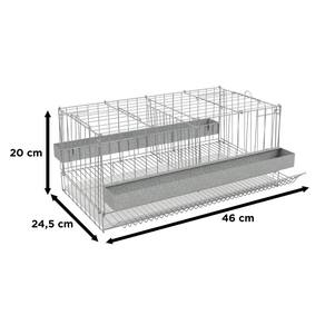 A Gaiola Poedeira para Codorna Desmontável com Divisão é a solução ideal para quem deseja criar codornas em um ambiente seguro e confortável. Com arame BTC zincado de alta qualidade e um fundo de chapa removível, essa gaiola garante a durabilidade e a praticidade necessárias para o seu negócio. Além disso, a Gaiola Poedeira para Codorna Desmontável com Divisão conta com uma série de recursos que a tornam ainda mais conveniente. Com bebedouro e comedouro inclusos, duas portas na parte superior para facilitar a manutenção e uma leve inclinação para coletar os ovos, essa gaiola é uma excelente escolha para criadores que buscam eficiência e praticidade. Comprimento: 46 cm Altura: 20 cm Largura: 24,5 cm Marca: Não Informado