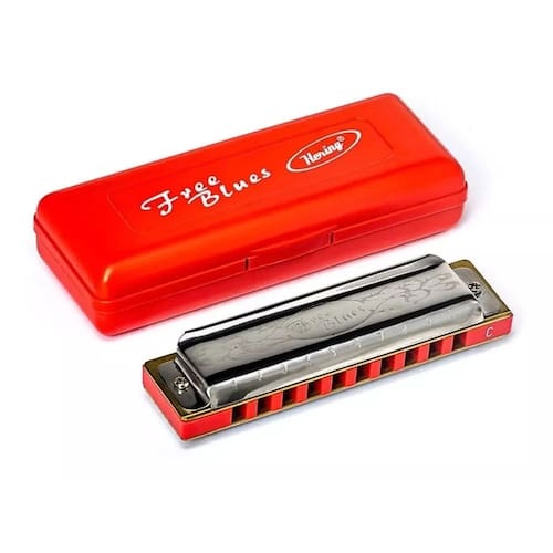Gaita Free Blues em Dó 10 furos Diatônico Hering 7020G. A Gaita Diatônica Hering Free Blues 7020G possui corpo em ABS vermelho, chapa de vozes com 0,90 mm de espessura, e afinação em Sol (G). As gaitas Hering oferecem ótima qualidade, construção, facilitando a manutenção e aumentando a vida útil da harmônica, e também um custo beneficio excelente.