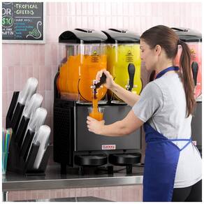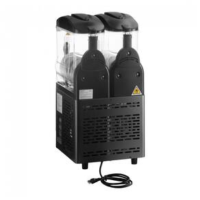 Ofereça bebidas congeladas irresistíveis com a Máquina de Bebidas Congeladas Granita Slushy Double da Galaxy! Com dois recipientes de 11,4 litros cada, feitos em policarbonato de alta densidade e resistente a trincas, esta máquina é perfeita para preparar uma variedade de bebidas refrescantes. Ela conta com modo slush para smoothies, slushies e granitas, além do modo chill para bebidas frias como sucos. A iluminação LED integrada exibe suas bebidas de forma atraente, aumentando as vendas por impulso. Seu painel digital permite selecionar o modo, a temperatura e a consistência de cada recipiente de forma simples e precisa. Puxe as alavancas para servir facilmente, enquanto as bandejas coletoras removíveis capturam qualquer resíduo, mantendo o local limpo. O visor de temperatura e os ícones indicativos facilitam o monitoramento do funcionamento, e o sistema permite ligar e desligar as luzes dos recipientes simultaneamente. Esta máquina é ideal para estabelecimentos que desejam oferecer bebidas variadas e de alta qualidade, combinando robustez, eficiência e design moderno. Requer conexão elétrica de 120V para operação.