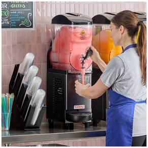 Apresente bebidas congeladas deliciosas e refrescantes com a Máquina Galaxy para Bebidas Congeladas Granita Slushy, equipada com uma tigela única de 11,36 litros fabricada em policarbonato de alta densidade e alta resistência contra trincas. Esta máquina versátil oferece dois modos de uso: modo slush para preparar smoothies, slushies e granitas, e modo chill para refrescantes bebidas frias, como sucos. A tigela transparente com iluminação LED destaca visualmente suas bebidas, aumentando significativamente as vendas por impulso em seu estabelecimento. O painel digital intuitivo permite selecionar facilmente o modo desejado, controlar a temperatura e ajustar a espessura, além de ligar ou desligar a iluminação da tigela. A operação é simples, basta puxar a alavanca para servir. Para maior praticidade e limpeza, um coletor removível capta quaisquer respingos ou gotas, mantendo seu espaço organizado. A máquina apresenta também um display de temperatura e ícones indicativos do modo atual, facilitando o monitoramento durante o uso. Ideal para estabelecimentos que buscam oferecer bebidas geladas irresistíveis com qualidade profissional, a Galaxy Slushy funciona com conexão elétrica de 110 volts, é eficiente com potência de 440 watts e possui design compacto que se adapta facilmente ao seu ambiente de trabalho.