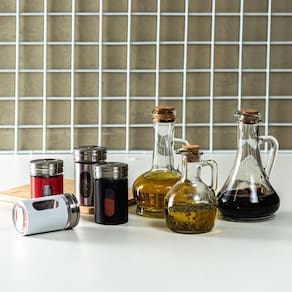 Que tal dar um de Master chefe em casa e arrasar na hora do preparo das refeições com esse lindo galheteiro Também pode ser levado a mesa para suas visitas temperarem a salada a gosto, ele vai complementar sua mesa posta com elegância e sofisticação. Galheteiro todo de vidro com tampa de rolha em cortiça Galheteiro de vidro, ideal para armazenar azeite e vinagre. Medidas: Largura 7 cm diâmetro/ altura 11,5 cm altura Capacidade: 180 ml Material: Vidro e Cortiça