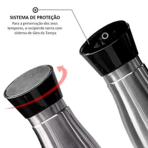 Para temperar, servir e desfrutar dos seus condimentos, este modelo dispõe de um mecanismo de proteção dos bicos e peneiras dos recipientes contra pó ou gordura do ambiente. Ou seja, ao utilizar o seu Porta Condimentos, apenas torça a tampa giratória em sentido horário a tampa de plástico (cor preta), para que apareçam as respectivas aberturas dos temperos.
