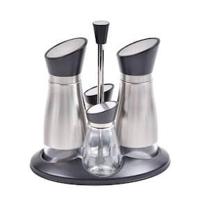 Galheteiro Para óleo E Vinagre/sal E Pimenta Em Inox Kenya KENYA KIT DE GALHETEIROS E SALEIROS EM INOX Altura - 22,7cm Largura - 15,8cm Profundidade - 22,5cm Peso - 1kg Sobre a Marca - A marca brasileira Kenya oferece produtos com ótima relação custo-benefício para os principais ambientes da casa, com seu portfólio dividido em Mesa, Vinho e Bar. Simplicidade e elegância são características fundamentais da marca, que traz em cada coleção de produtos para cozinha, banheiro, lavanderia, organização, entre outros, as novidades alinhadas com as últimas tendências do mercado internacional.