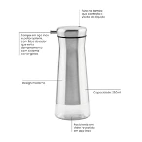 Tampa em aço inox e polipropileno, com bico dosador que evita derramamento com sistema corta-gotas.