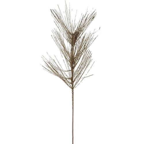 O galho possui flores decorativas longas e finas com 35cm de comprimento, conferindo leveza e movimento visual ao arranjo. A coloração champanhe com brilho sutil proporciona um efeito moderno e ao mesmo tempo tradicional, ideal para decorações natalinas mais refinadas.