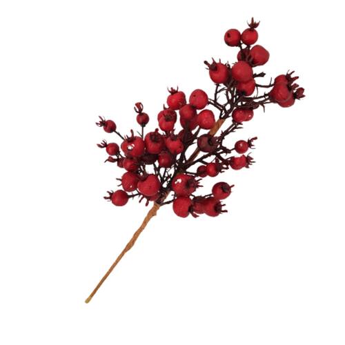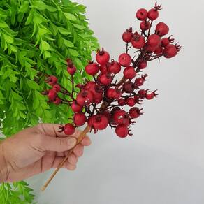 GALHO DECORATIVO COM 35Ccm DE ALTURA, ESTRUTURA EM ARAME REVESTIDO, DECORADO COM MINI FRUTINHAS ESTILO BAGAS EM EPS VERMELHAS.