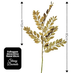 Com acabamento em glitter brilhante na tonalidade dourado, a haste mede 85cm de comprimento total — sendo 45cm de folhagem e 40cm de haste — oferecendo versatilidade para diversas composições decorativas, tanto em ambientes internos quanto em vitrines e espaços comerciais.