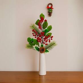 O design é enriquecido com berries vermelhos vibrantes e pinha natural, compondo uma peça charmosa e versátil para arranjos, guirlandas, centros de mesa ou para complementar a decoração da árvore de Natal.